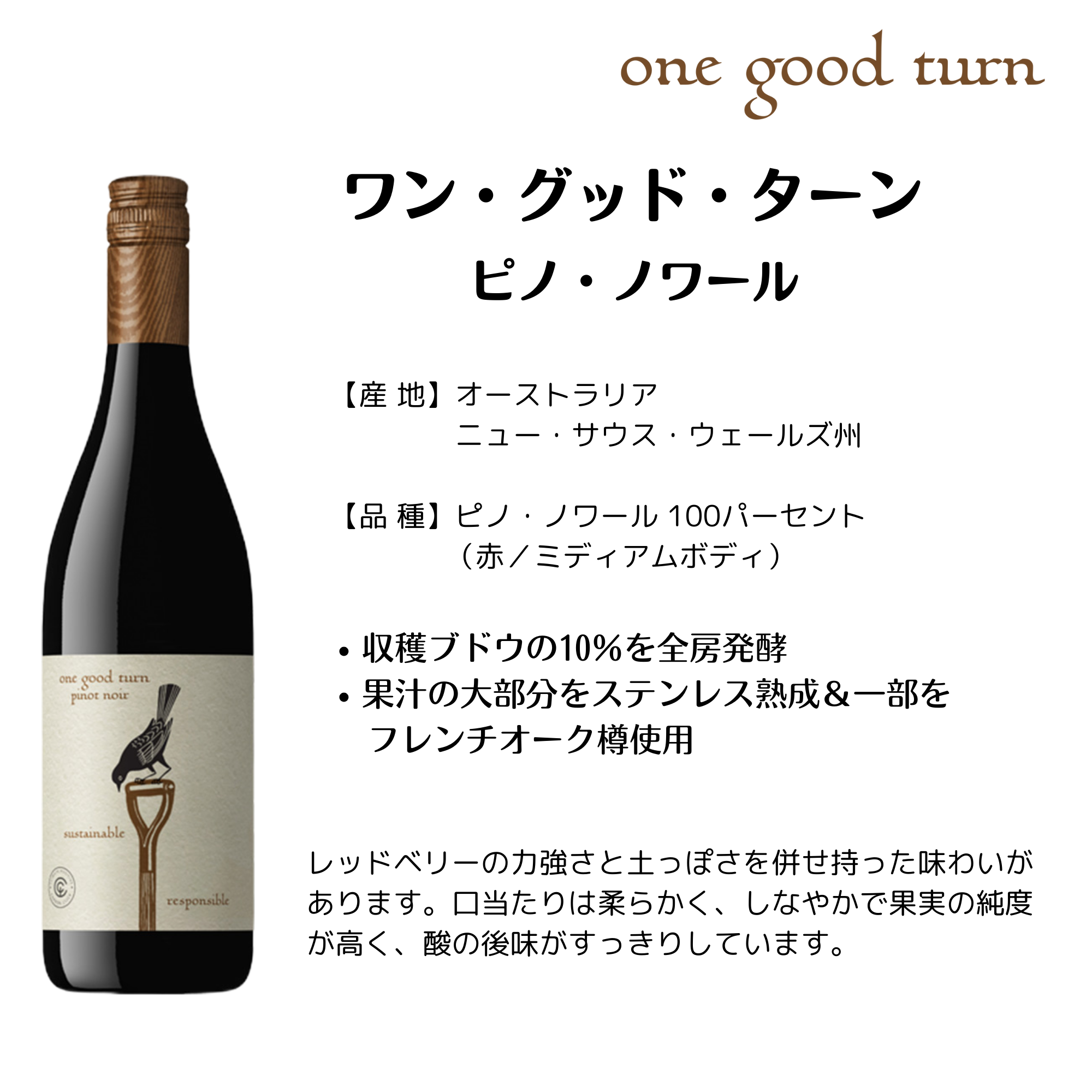 白桃、和梨、青りんごのアロマ。フレッシュで爽やかな味わいで、冷涼産地ならではのクリーンな余韻が印象的なシャルドネです。クリーム系のソースを使ったお料理等。「ワン・グッド・ターン ピノ・ノワール」