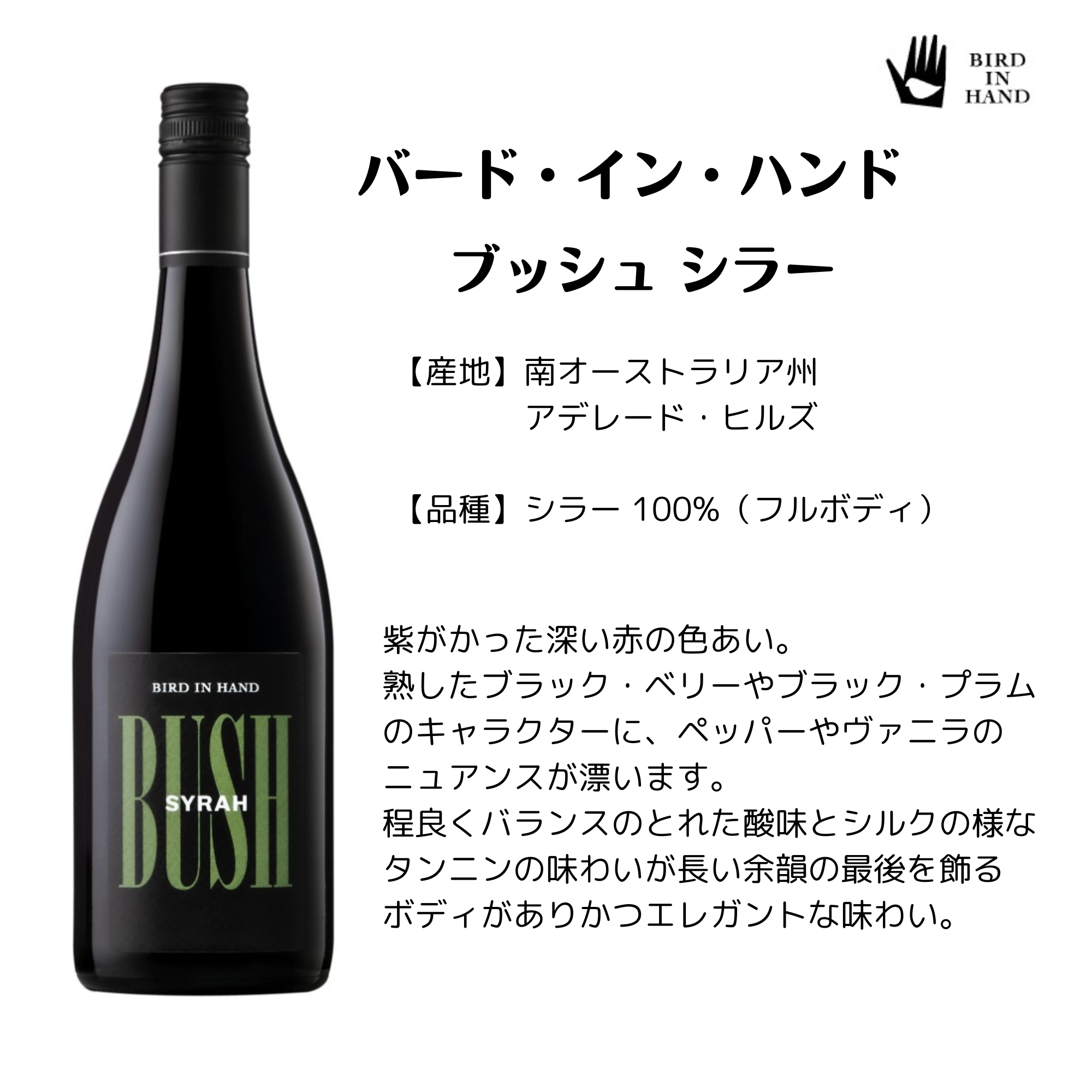 レッドベリーの力強さと土っぽさを併せ持った味わいです。口当たりは柔らかくしなやかで、果実の純度が高く、酸の後味がすっきりしています。トマトベースの一品やタレの焼き鳥などとどうぞ。「バード・イン・ハンド ブッシュ・シラーズ」