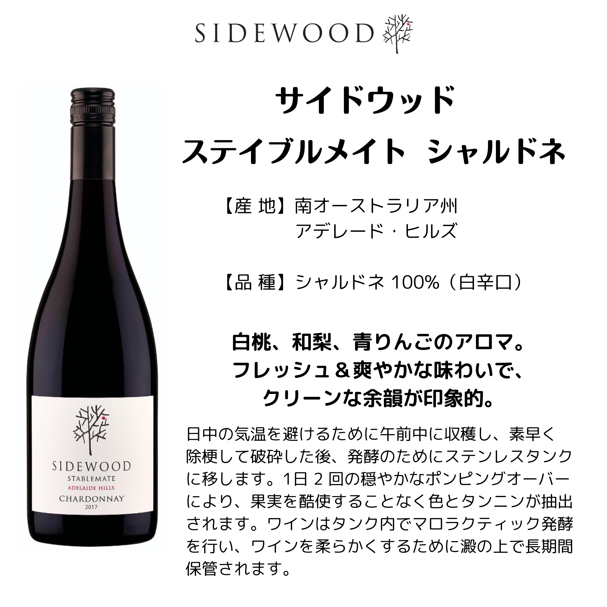 柑橘類、焼いたナッツ、わずかに蜂蜜の香りが漂う、 生き生きとしたアロマティックな白のブレンドです。シュール・リーにより、風味を損なうことなくテクスチャーを増してています。口当たりは明るい果実味とすっきりした酸が感じられます。前菜や海鮮などと好相性です。「サイドウッド ステイブルメイト シャルドネ」