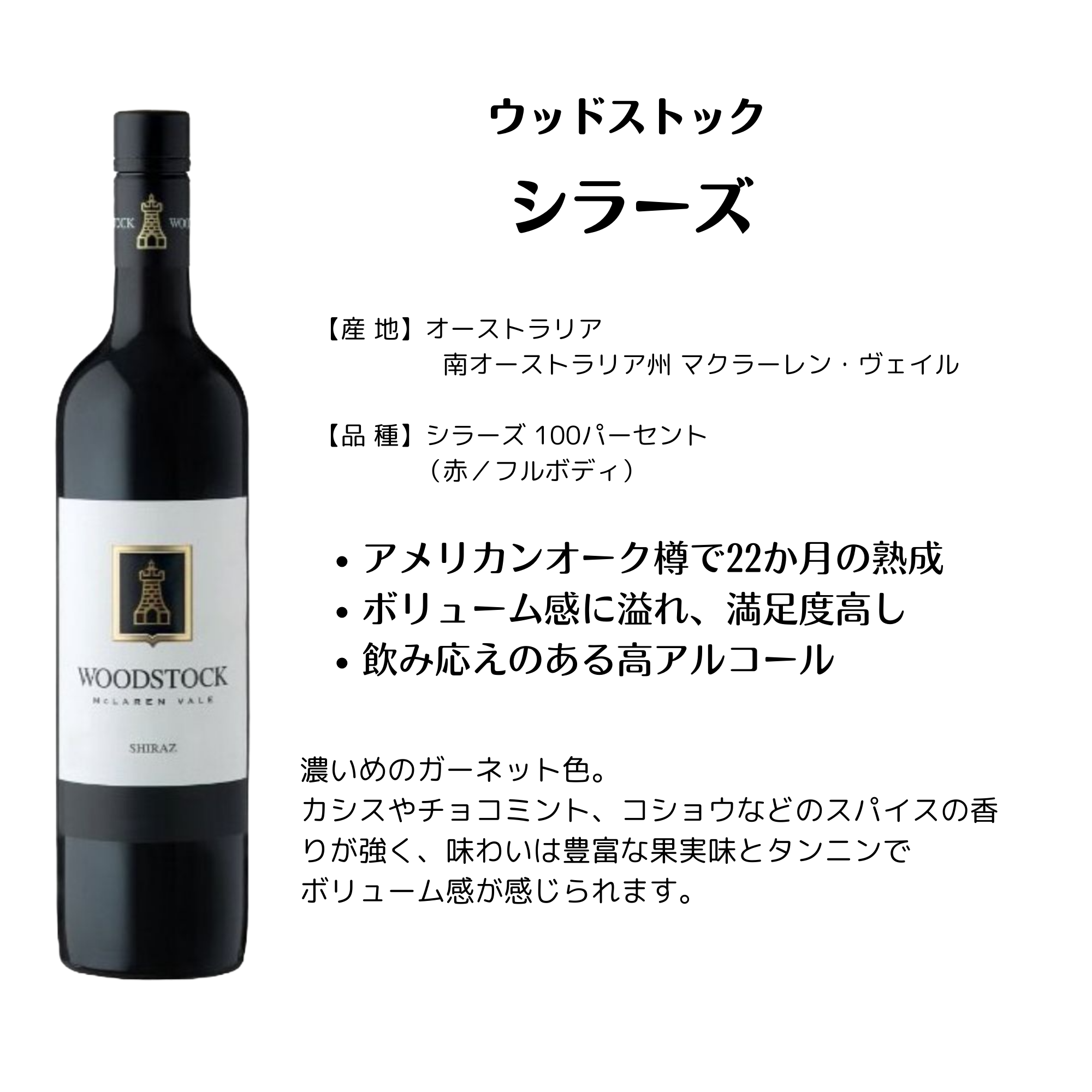 グァバやパッションフルーツのようなテイスト。ミネラル感のある塩味と複雑なニュアンスがあります。VINUM誌にてトップソーヴィニヨン・ブラン。「ウッドストック シラーズ」(南オーストラリア州マクラーレン・ヴェイル産)