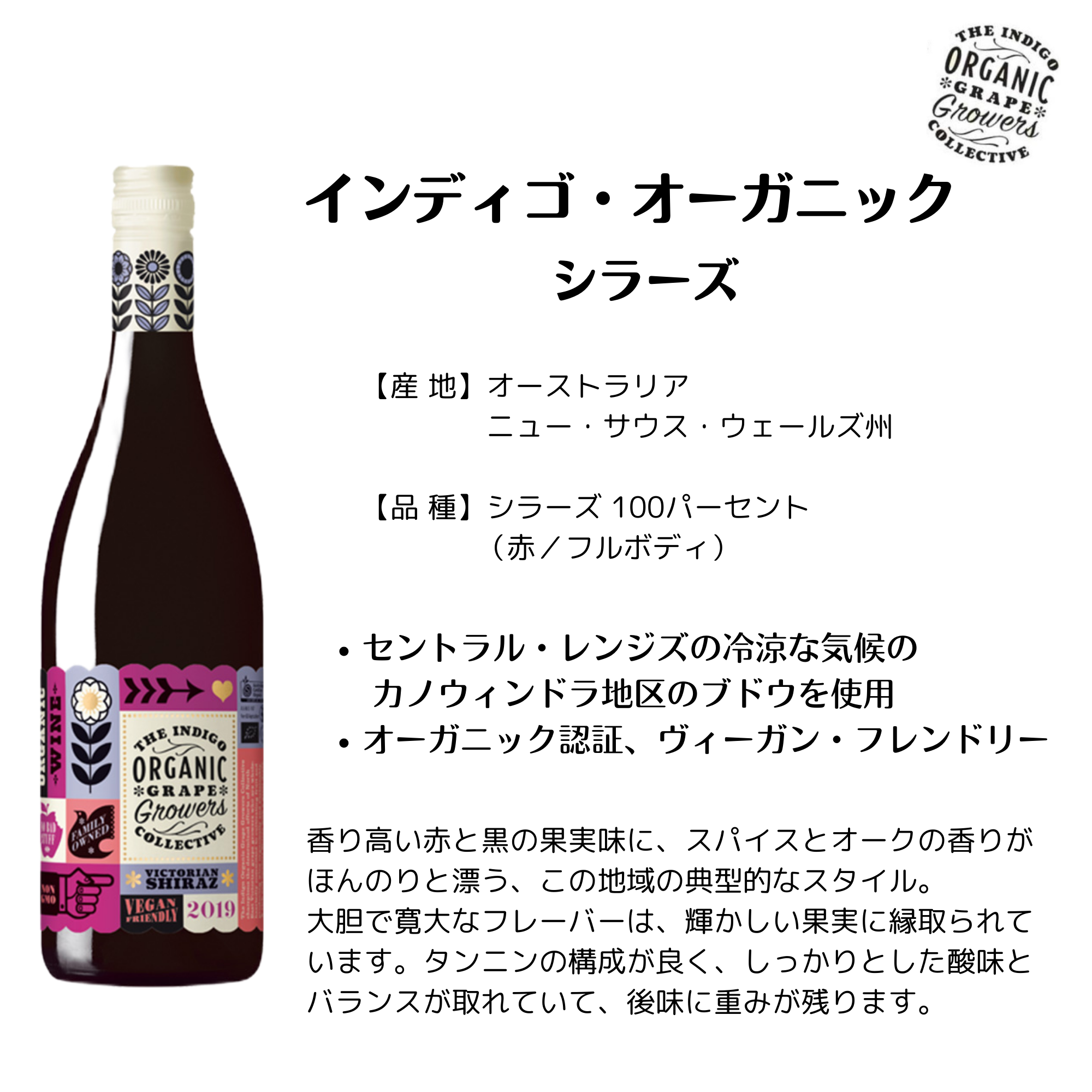 鮮やかな赤い果実がグラスから飛び出します。ラズベリーや桑の実を想わせる豊かな味わいで、柔らかなタンニンが果実を縁取っています。生き生きとしたメルローは、人々を魅了すること間違いなしです。「インディゴ・オーガニック・シラーズ」(NSW州 南東オーストラリア産)