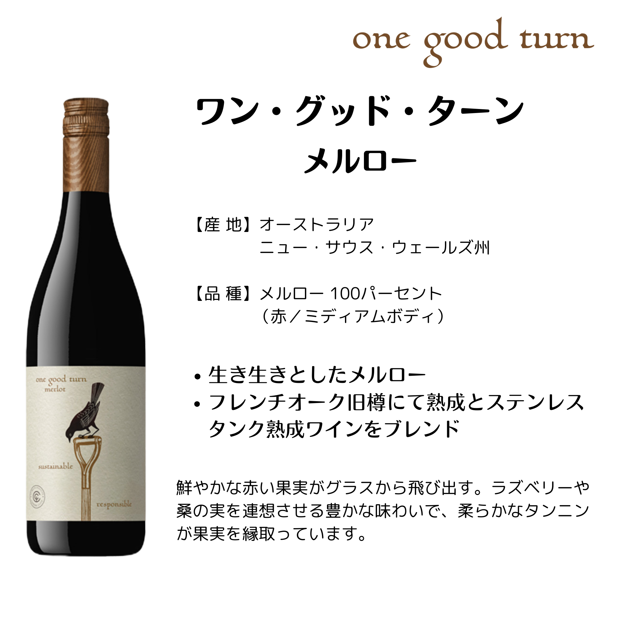 フェネルブランカ、土、ブランブルキイチゴの果実。トニック、レッドリコリス、クローブを彷彿とさせる香りと魅力的でジューシーな香りもあります。100%全房発酵。無濾過無清澄ワイン。「ワン・グッド・ターン メルロー」(NSW州 南東オーストラリア産)